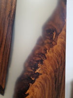 Fiecare detaliu al blatului evidențiază frumusețea unică a nucului, cu variații de culoare calde și o textură bogată care aduc un strop de natură autentică în interiorul casei tale. Inserțiile de rășină epoxidică, cu un finisaj satinat elegant, curg printre secțiunile de lemn, creând un efect vizual captivant și o armonie subtilă între cele două materiale. Aspectul satinat al rășinii oferă o reflexie blândă a luminii, adăugând o notă de sofisticare discretă.